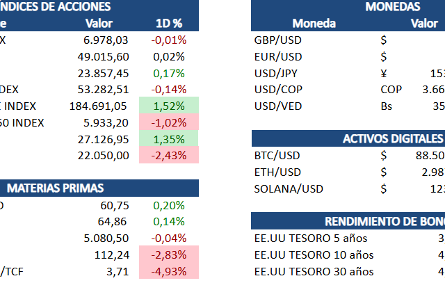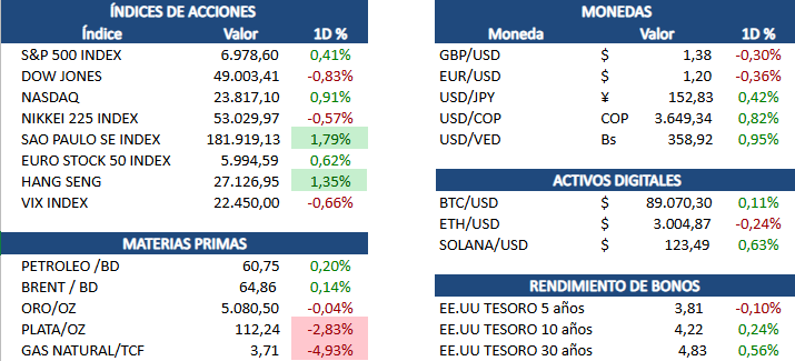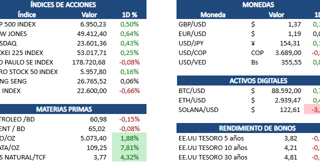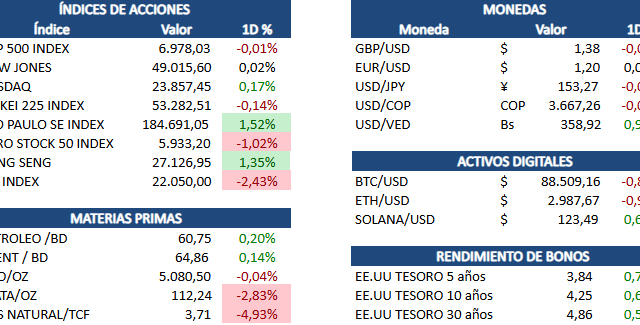 El oro cerró por primera vez en su historia por encima de USD 5.000 por onza, extendiendo un repunte semanal que marca el mejor desempeño en más de cuatro décadas para los metales preciosos, con la plata también alcanzando niveles récord. El dólar continuó debilitándose ampliamente, particularmente frente al yen japonés, en medio de preocupaciones sobre posibles intervenciones cambiarias en Tokio y tensiones en los mercados de bonos nipones que podrían estar afectando los rendimientos estadounidenses. Los precios de las materias primas mostraron fortaleza generalizada con el cobre superando USD 12.000 por tonelada, mientras los futuros de gas natural subieron hasta 10 % por expectativas de un invierno frío en la costa este.