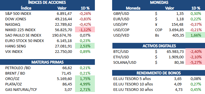 Las negociaciones nucleares entre EE.UU. e Irán reanudarán el jueves en Ginebra, confirmó el mediador omaní, mientras Washington mantiene su mayor presencia militar en Oriente Medio en décadas: dos portaaviones, el USS Abraham Lincoln y el Gerald R. Ford, más decenas de cazas F-35. El canciller iraní Araghchi reconoció que ambos lados acordaron «principios rectores» en la ronda anterior, aunque el vicepresidente Vance señaló que Irán no reconoció las «líneas rojas» de Trump. Imágenes satelitales del ISIS muestran que Irán continúa reforzando con concreto los túneles del complejo de Natanz para protegerlos de posibles ataques aéreos. El crudo Brent se mantiene por encima de USD 71 el barril y el VIX supera su promedio histórico de 20 ante la escalada geopolítica.
