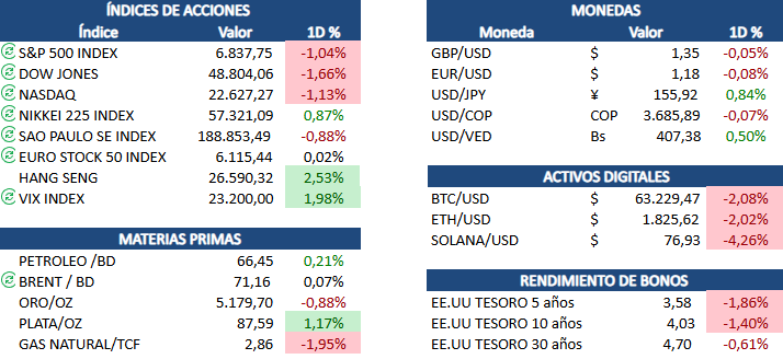 Los mercados estadounidenses cayeron el lunes con fuerza: el Dow perdio 821 puntos (-1,66%) cerrando en 48.804, el S&P 500 bajo 1,04% a 6.837 y el Nasdaq cedio 1,13% a 22.627, en una sesion marcada por temores arancelarios y de disrupcion de inteligencia artificial. IBM se desplomo 13% tras las nuevas capacidades de programacion de Claude Code de Anthropic, su peor dia desde el ano 2000, mientras acciones de ciberseguridad como CrowdStrike y Zscaler perdieron 10% por la nueva herramienta de seguridad de la misma empresa. El sector financiero fue el mas golpeado con caidas superiores al 3%, liderado por KKR (-8,9%), American Express (-7,2%) y Goldman Sachs (-4%), mientras los futuros del martes apuntan a una leve recuperacion.
