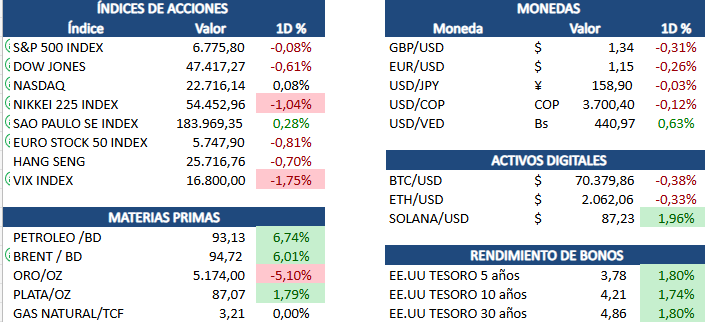 El precio del petroleo volvio a superar los USD 100 por barril tras la intensificacion de los ataques iranies en el Estrecho de Ormuz, donde tres nuevos buques fueron alcanzados durante la noche del miercoles. Brent cerro en USD 91,98 (+4,8%) y WTI en USD 87,25 (+4,6%), pero ambos superaron brevemente los USD 100 y USD 93 respectivamente en la sesion del jueves, mientras el trafico maritimo permanece practicamente paralizado. El nuevo lider supremo de Iran, Mojtaba Khamenei, declaro que el estrecho debe seguir cerrado y que cualquier buque vinculado a EE.UU., Israel o aliados sera considerado objetivo legitimo. El secretario de Energia Chris Wright admitio que la Armada estadounidense no esta lista para escoltar petroleros y que no podra hacerlo hasta finales de marzo, lo que acentuo la presion alcista sobre el crudo.