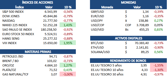 Trump anuncio una pausa de cinco dias en los ataques contra la infraestructura energetica de Iran tras lo que describio como «conversaciones muy buenas y productivas» con Teheran, lo que disparo un rally generalizado en Wall Street con el Dow subiendo 631 puntos (+1,38%), el S&P 500 cerrando en 6.581 (+1,15%) y el Nasdaq avanzando 1,38%. Sin embargo, Iran nego cualquier dialogo con Washington a traves de su Ministerio de Relaciones Exteriores y el presidente del Parlamento, Mohammad Bagher Qalibaf, mientras el crudo Brent se desplomo hasta 11% intradía a USD 99,94 antes de recuperarse parcialmente. Los futuros del martes abren con cautela: S&P -0,23%, Dow -0,28% y Nasdaq -0,17%, con el WTI recuperando terreno por encima de USD 91 tras las desmentidas iraníes. Goldman Sachs elevo su proyeccion de Brent a USD 110 promedio para marzo-abril y advirtio que si los flujos por Hormuz permanecen al 5% por 10 semanas, los precios superarian el récord de 2008.