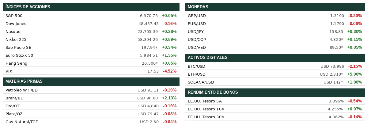 Bancos de EE.UU. culminan semana de resultados con récords en mercados de capitales. Morgan Stanley cerró la temporada de reportes de los grandes bancos con una ganancia del 29% en utilidades hasta USD 5.57 mil millones, impulsada por ingresos récord en renta variable de USD 5.15 mil millones y un alza del 36% en banca de inversión. Bank of America también superó expectativas con un salto del 17% en ganancias hasta USD 8.6 mil millones y utilidad por acción de USD 1.11, un 25% más que el año anterior, con trading de acciones al alza del 30%. Completando el ciclo, Goldman Sachs reportó un incremento de ingresos del 14% con su mesa de equities en récord de USD 5.33 mil millones, y JPMorgan divulgó ingresos récord de mercados de USD 11.6 mil millones; en todos los casos los escritorios de trading de renta variable establecieron marcas históricas en el primer trimestre. Los resultados superaron las expectativas en un entorno complicado por la guerra en Irán, ratificando la resiliencia del sector financiero aunque con incertidumbre en el outlook para préstamos.